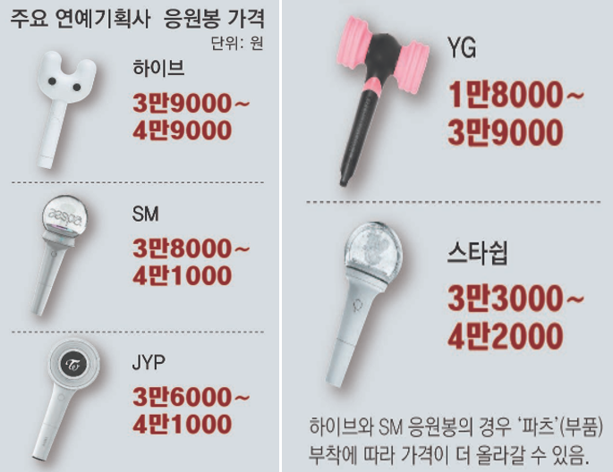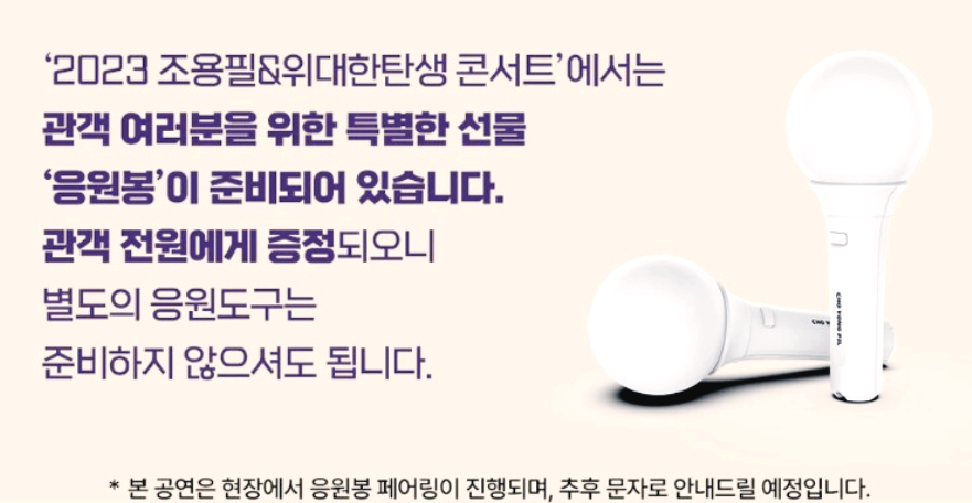 다른 아이돌 콘서트에서는 응원봉이 필수적으로 구매해야 하는 요소인데, 조용필 콘서트에서는 관객들을 위한 응원봉을 준비하여 관객 전원에게 무상으로 증정된다고 소개하고 있습니다. 2016년도까지는 응원봉이 1만 원대에 불과하였는데, 현재는 콘서트장의 응원봉이 연예기획사마다 가격이 천차만별이며, 하이브의 경우는 응원봉의 가격이 4만 9천 원으로 책정되면서, 기획사 중에서 가장 비싸게 책정되어 있습니다.