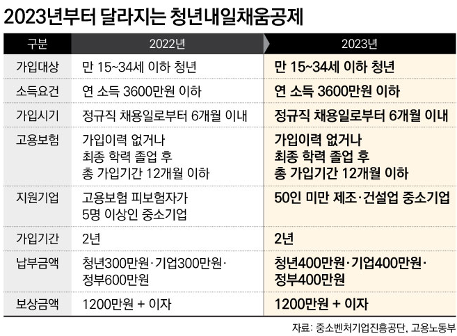 2023년부터 달라지는 청년내일채움공제는 가입대상은 만 15세부터 34세 이하의 청년이며, 소득은 연 3600만원 이하이며, 정규직 채용일로부터 6개월 이내이며, 고용보험에 가입이력이 없거나, 최종학력 졸업 후 총 가입기간 12개월 이하는 똑같으며, 지원기업은 50인 미만 제조 및 건설업 중소기업으로 2023년부터는 지원기업이 확대됩니다. 가입기간은 2년이며, 납부금액은 청년 400만 원, 기업 400만 원, 정부 400만 원이며, 보상금액은 1200만 원 + 이자를 받게 됩니다.