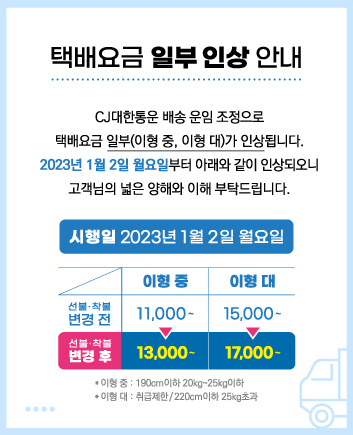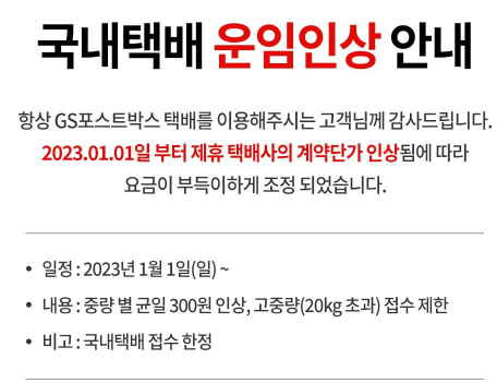 CJ 대한통운은 배송 운임 조정으로 인해, 택배 요금 일부(이형 중, 이형 대)가 인상된다고 발표했으며, 시행일은 2023년 1월 2일 월요일부터 인상된다고 공지하였습니다.