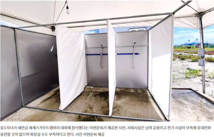 여가부 김현숙 장관은 본인이 직접 인터뷰에서 '저희가 배수로를 만들었어요. 가보시면 가로세로 배수로가 다 있어서 물 빠짐이 잘 일어나고 있어요'라고 확인을 시켜주었습니다. 하지만, 실제로는 배수가 되지 않아 곳곳이 모두 다 웅덩이여서, 청소년들이 야영을 할 수가 없었습니다.
