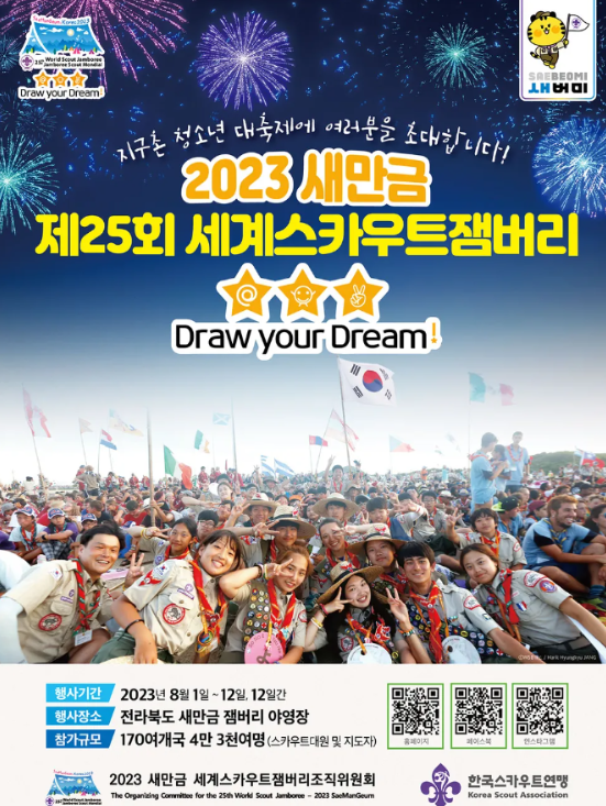 현재 전라북도 새만금에서는 2023 새만금 세계스카우트 잼버리 대회가 열리고 있습니다. 전 세계 170여 개국 총 43,000명이 참가하는 전 세계 스카우트들이 모여서 야영을 하는 세계 청소년 야영 축제입니다. 4년마다 열리는 이 대회는 한국이 유치하기로 결정했으며, 8월 1일부터 8월 12일간 열리게 되었습니다.
