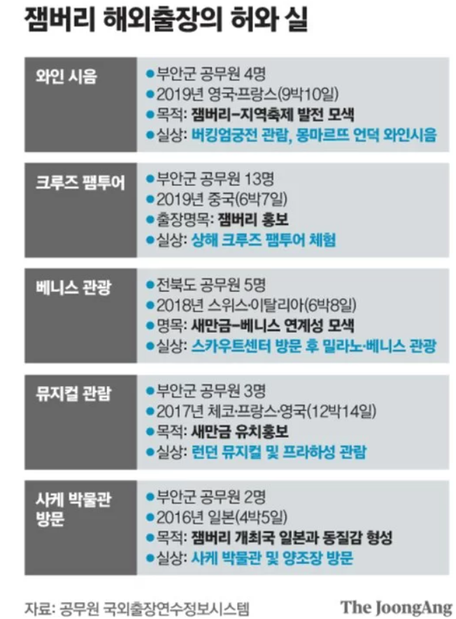 2019년 영국, 프랑스 출장을 다녀온 공무원 4명은 잼버리 지역축제 발전 마련하기 위해 출장을 갔으나, 실상은 버킹엄궁전 관람과 몽마르트르 언덕 와인시음을 하는 등 잼버리와는 전혀 상관없는 것에 돈을 사용했으며, 잼버리 홍보를 위해 중국에 출장을 간 공무원 13명은 상해 크루즈 팸투어 체험을 하였으며, 2017년 새만금 유치를 위해 영국, 프랑스, 체코에 출장을 간 공무원은 런던 뮤지컬과 프라하성을 관람하기도 하였습니다. 이런 식으로 정치인들과 공무원들의 도덕적 해이가 지금의 새만금 잼버리 대회를 망치게 되었으며, 정부는 이 사건을 적극적으로 재조사할 필요가 있다고 생각합니다.