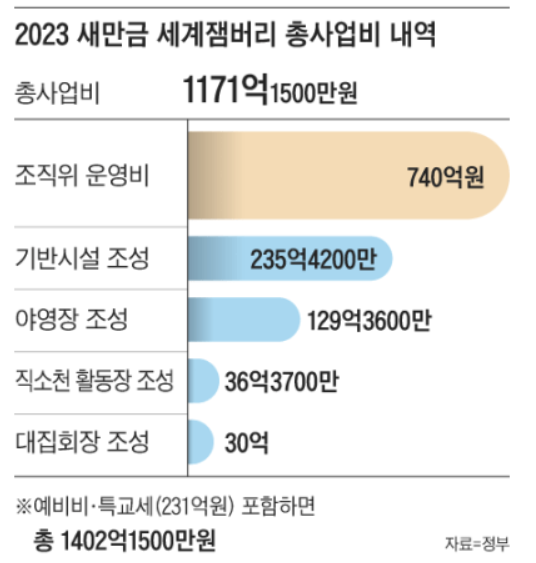 현재 파행을 빚고 있는 2023 새만금 세계스카우트 잼버리대회는 총사업비가 무려 1,171억 원이 들었으며, 2015년 일본 잼버리 대회가 380억 원을 드린 것에 비하면 약 3배가 넘는 비용이 들었습니다. 하지만, 총 사업비 이외에도 추가로 정부, 지자체 예비비와 특별교부세 231억 원이 투입되어 총 1,402억 원이 들었다고 합니다.