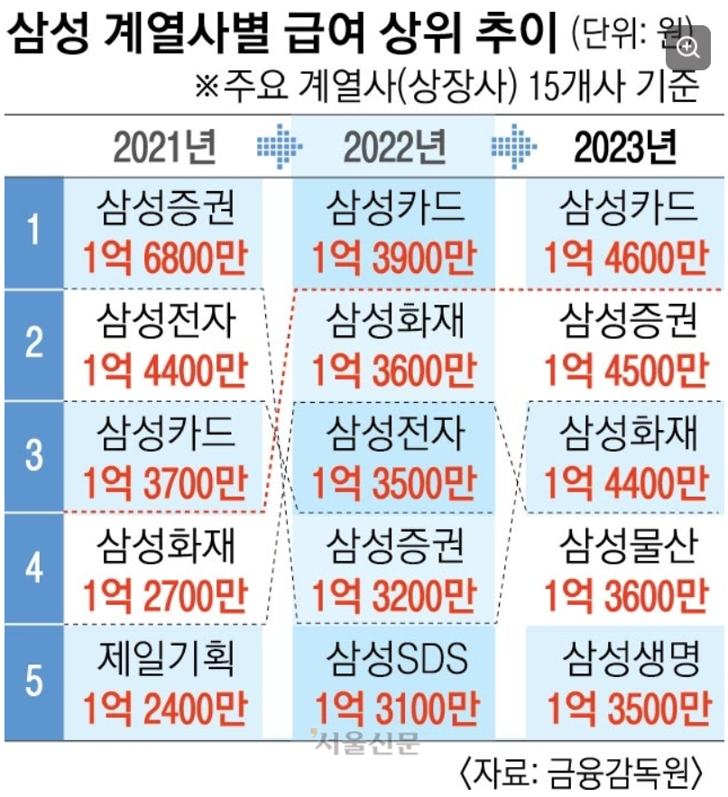 그럼, 대한민국 최고기업이라고 불리는 삼성의 계열사별 평균 연봉을 살펴보자면, 2023년에는 삼성카드가 1위에 올랐으며, 삼성증권이 2위에 선정되었습니다.