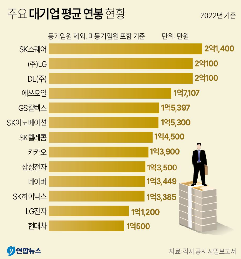 그럼, 주요 대기업들의 평균연봉을 살펴보면, SK스퀘어가 1위로 평균연봉 2억 1400만 원을 기록했으며, (주)엘지가 2억 100만원, (주)DL이 2억100만원, 4위로는 에스오일이 1억 7107만원을 차지했습니다.