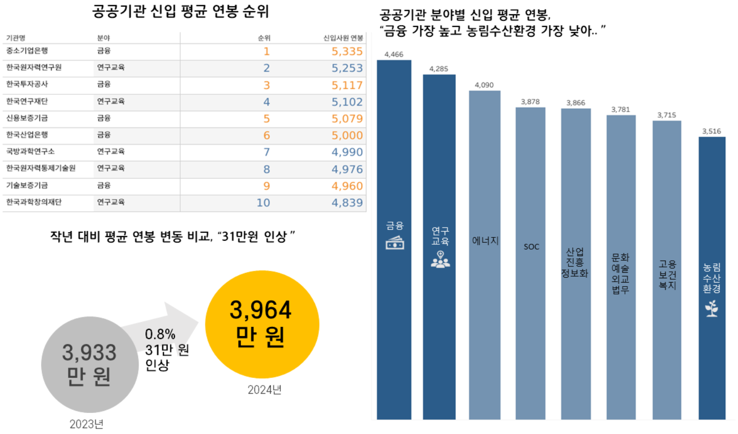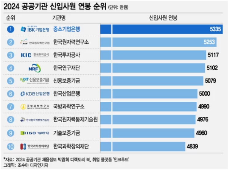 올해 공공기관 전체의 신입사원 평균 연봉은 3,964만원으로 집계가 되었으며, 지난해보다 0.8% 올랐으며, 2021년도 대비로는 3%가 높게 나왔습니다. 2024년도 공공기관 신입사원 연봉 1위로는 중소기업은행이 뽑혔고요, 역시나 돈을 가장 잘 버는 은행의 신입사원 연봉이 5,335원으로 1위를 차지했습니다.