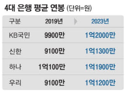 그럼, 4대 시중은행들의 평균 연봉을 살펴보면, KB국민은행이 1억 2천만 원으로 1위를 차지했으며, 2위는 하나은행으로 1억1900만 원을 차지했습니다.