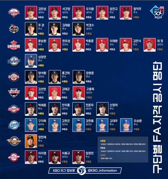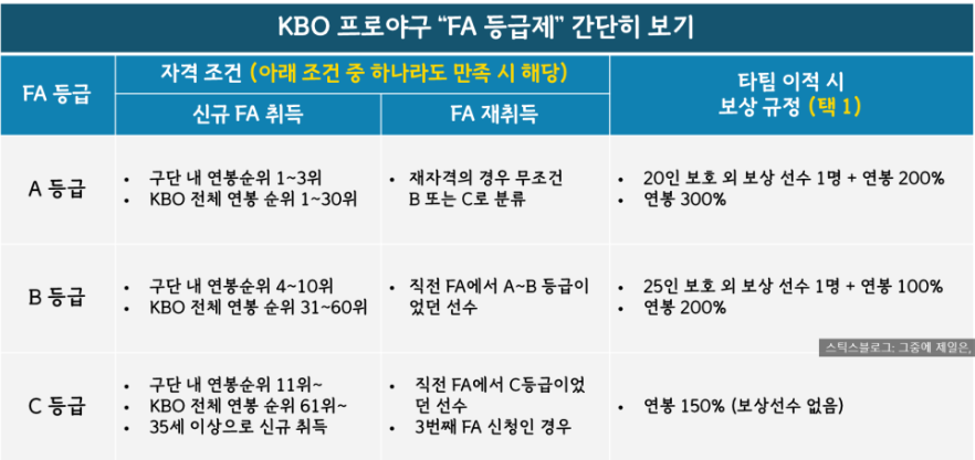 2023년도 프로야구는 한국시리즈에서 LG트윈스가 KT위즈를 꺽고 우승으로 마무리하였습니다. 이제는 돈의 전쟁이 시작되는 스토브리그가 개막되는 2024년FA 가 기다리고 있는데요. 2024년 프로야구 FA 선수는 누가 있으며, 그 선수들의 등급 및 보상선수는 어떻게 되는지 설명드리겠습니다.