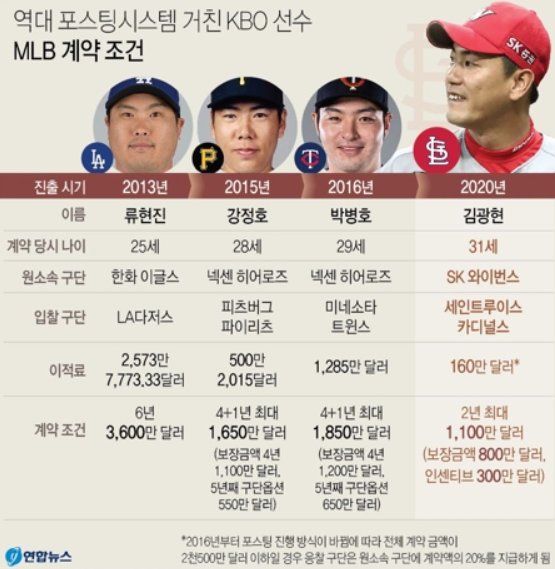 또한, 고우석의 경우도 최근 LG에서 제안한 비FA계약으로는 최대인 8년 200억 원을 거절했다는 이야기가 나왔었을 정도로, 해외리그 진출을 노리고 있습니다. 고우석도 2023시즌 이후, 이정후와 함께 포스팅을 통해 메이저리그 진출을 타진할 것으로 보입니다.