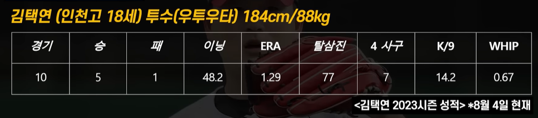 올시즌 인천고 3학년 김택연 선수는 총 48.2이닝을 던지면서 77개의 탈삼진과 단 7개의 4사구만을 내주는 최고의 성적을 내고 있습니다. 숫자만으로 보면, 김택연 선수가 황준서 선수보다 훨씬 더 좋은 기록을 가지고 있습니다. 또한, 김택연 선수는 올해 최고 153km까지 찍으면서, 황준서 선수보다 더 빠른 구속을 자랑하고 있습니다. 구속으로만 보면 장현석 선수 다음으로 빠른 공을 가지고 있는 선수입니다. 김택연 선수의 주 무기는 커터성의 슬라이더이며, 김택연 선수는 오승환 선수나 고우석 선수와 비슷한 체격을 가지고 있으며, 이들보다 고등학교 때 성적은 더 좋은 것이 사실입니다.
