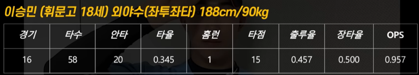 휘문고 3학년인 이승민은 5 툴(타격, 장타력, 주력, 수비, 송구) 플레이어에 맞는 선수이며, 이승민의 아버지는 LG트윈스의 전설인 이병규 현 삼성라이온즈 코치입니다. 현재 타율 0.345, 홈런 1개, 출루율 0.457, OPS 0.957을 기록할 정도로 좋은 스탯을 나타내고 있으나, 1년 선배인 김민석보다는 확실히 떨어지는 실력을 가지고 있어서, 1라운드보다는 2라운드에서 뽑힐 가능성이 크며, 엘지 트윈스에서는 2라운드 8 순위권을 가지고 있는데, 아버지에 이어서 엘지에서 이승민을 선택할지도 관건입니다.