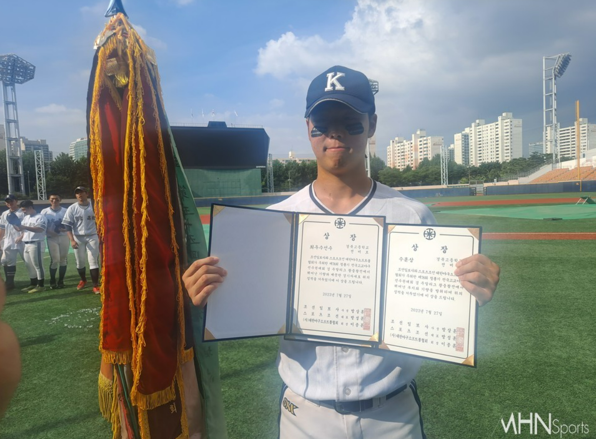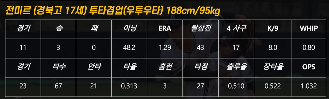 경북고 3학년인 전미르는 한국의 오타니로, 유일하게 투타겸업이 가능할 유일한 자원으로, 투수로서도 48.2이닝동안 탈삼진 43개, 4 사구 17개로 방어율 1.27을 기록하고 있으며, 타자로서도 타율. 313, 홈런 3개 타점 27개, 출루율 0.510, OPS 1.032를 기록할 정도로, 저는 타자로서의 가능성을 좀 더 높게 보고 있습니다. 전미르는 30년 만에 경북고를 우승시키며, 청룡기 최우수선수로 뽑힌 전미르의 가치는 점점 더 올라가고 있습니다. 특히 투수로서도 150km를 던지면서 좋은 방어율을 기록하고 있는 상황이라, 3순위 롯데, 4순위 삼성, 5순위 NC 이 3팀 중에서 전미르를 뽑게 되면, 어떤 선수로 키울지가 매우 고민될 것 같습니다. 일단 투수로서 키우다가 그저 그런 선수가 될 바에는 타자로서 키우는 게 개인적으로는 더욱 좋아 보입니다.