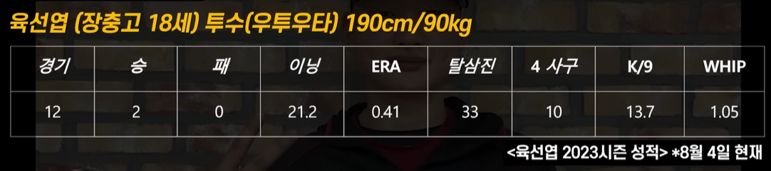 장충고의 원투펀치는 황준서와 육선엽을 뽑을 수 있는데요. 육선엽은 21.2이닝을 던지면서 탈삼진 33개, 4사구 10개를 기록하면서 방어율 0.41을 기록하고 있습니다. 올시즌에는 황준서보다 더 빠른 151km의 강속구를 뿌린 적이 있으며, 제구력은 황준서보다 떨어지지만, 위기상황에서 점수를 주지 않는 짠물투구를 하는 투수입니다. 슬라이더, 스플리터, 커브 등 직구제구가 되지 않을 때에는 여러 가지 다양한 변화구를 통해 카운트를 잡는 유형의 투수입니다.