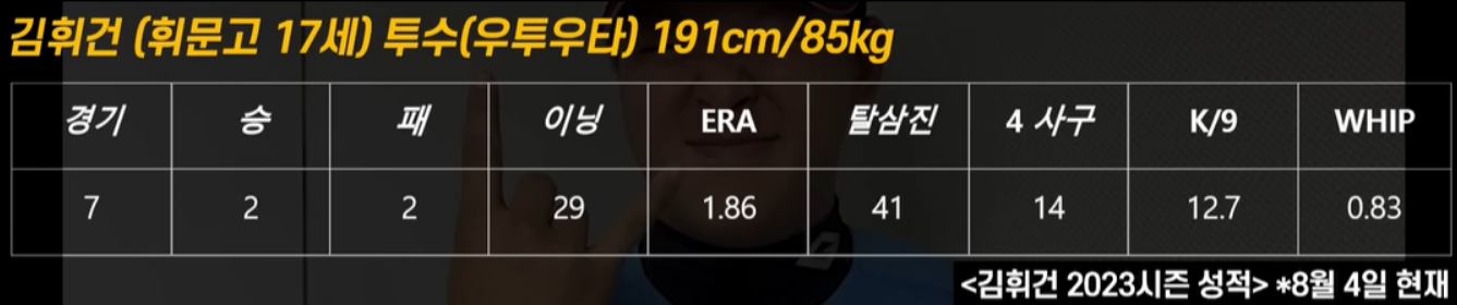 휘문고 3학년 김휘건은 191cm의 큰 키와 100kg에 육박하는 피지컬을 가지고 있는 투수이며, 올시즌 29이닝동안 탈삼진 41개와 4 사구 14개를 내주면서 방어율 1.86을 기록하고 있습니다. 북일고 1학년때부터 145km를 기록하면서 유명세를 떨쳤으며, 올시즌에는 휘문고로 전학을 오면서, 150km를 기록한 바 있으며, 비공식적으로는 154km까지 기록할 만큼 빠른 강속구를 가지고 있는 투수입니다. 김휘건은 부모님과 남동생이 모두 농구선수이며, 어머니는 농구 국가대표를 지낸 적이 있을 정도로 훌륭한 운동선수 DNA를 가지고 있는 선수이기도 합니다.