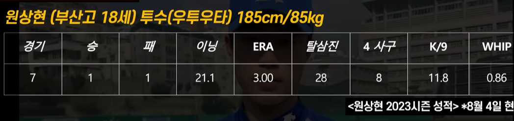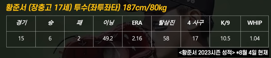 방어율은 2.16으로 고등학생치고는 좋은 성적이지만, 압도한다고는 볼 수 없는 방어율입니다. 황준서보다 좋은 방어율을 기록하고 있는 선수들도 꽤 많습니다. 황준서 선수는 날카로운 제구력을 보유하고 있지만, 올해 초에는 자신의 최고속도인 150km를 기록하면서, 제구력뿐만 아니라 스피드도 갖춘 선수로 발전하고 있습니다. 황준서의 주무기는 스플리터이며, 좌완투수의 이점을 갖춘 수준급의 슬라이드와 커브 등을 갖추고 있습니다. 특히, 한화는 좌완 선발투수가 없으며, 좌완 구원투수 중에서도 김범수를 제외하면 거의 전무하기 때문에, 좌완투수가 꼭 필요하다 보니, 한화이글스는 황준서 선수를 뽑을 가능성이 높은 상태입니다.