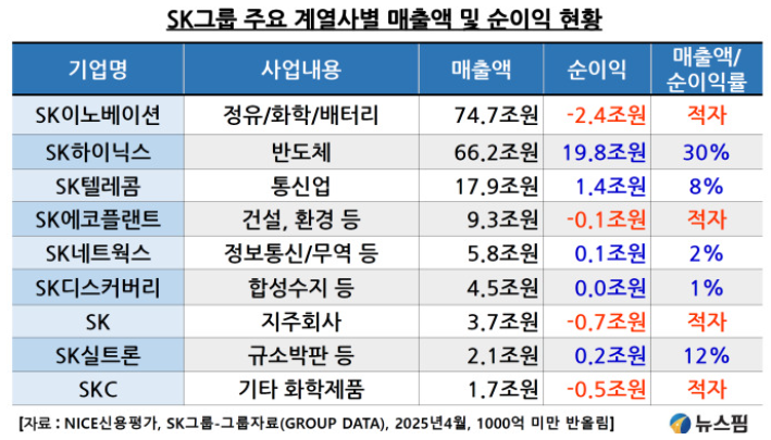 SK그룹의 가장 큰 매출을 차지하고 있는 회사는 SK이노베이션으로 74.7조 원의 매출을 기록하였지만, 순이익은 적자를 기록하였습니다. 또한, SK에코플랜트, SK지주사, SKC 등의 회사등도 적자기업이네요.