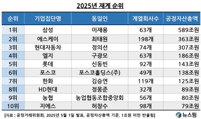 즉, 2025년도 재계 순위인데, 역시나 삼성이 1위를 차지하였으며, 2위는 SK, 3위부터는 현대자동차 그룹, 엘지그룹, 롯데그룹, 포스코그룹, 한화그룹순으로 나타났습니다.