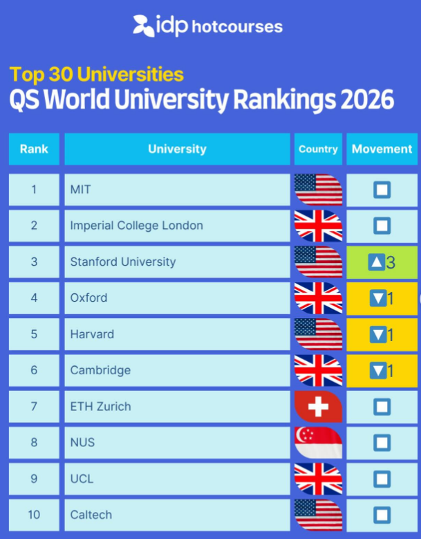 - Oxford, MIT, Harvard, Stanford, Cambridge 등은 평가 방식에 상관없이 항상 상위권에 랭크됩니다.