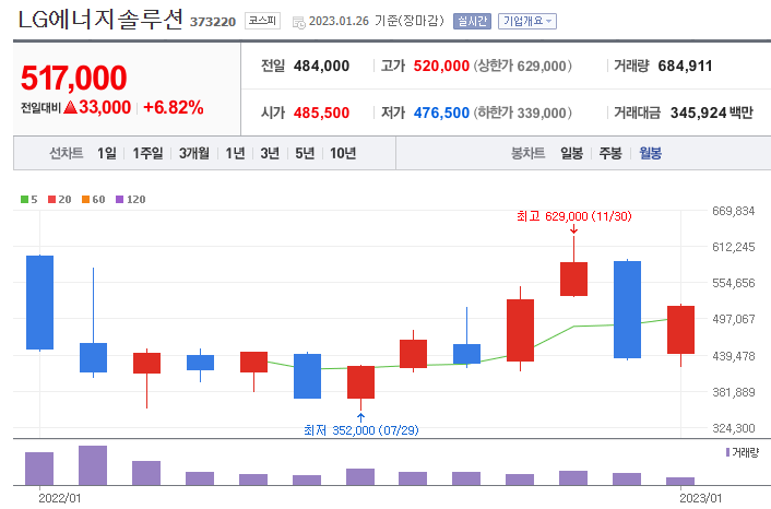 어느덧, LG에너지솔루션이 상장한 지 1년째가 되고 있습니다. 공모가 30만 원이었던 LG에너지솔루션은 현재 주가가 51만 원 이상으로 거래되고 있으며, 상승률은 72.33%이며, 보호예수 물량 7,924,939주가 1월 30일부로 전부 다 풀리게 되어, 최대 약 4조 972억의 매도 우위가 예상됩니다.