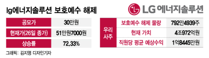 LG에너지솔루션은 지난해 초 상장 과정에서 직원 9564명에게 1주당 30만 원씩 총 815만 주를 배정했으며, 공모가 기준으로 2조 4464억 원어치였습니다.