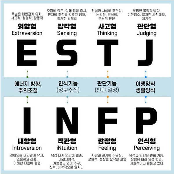 마이어스 브릭스 유형 지표(The Myers-Briggs-Type Indicato)의 약자로, MBTI는 작가 캐서린 쿡 브릭스와 그녀의 딸인 이자벨 브릭스 마이어스가 심리학 분석을 통해, 1944년 개발한 자기 보고형 성격 유형 검사입니다.