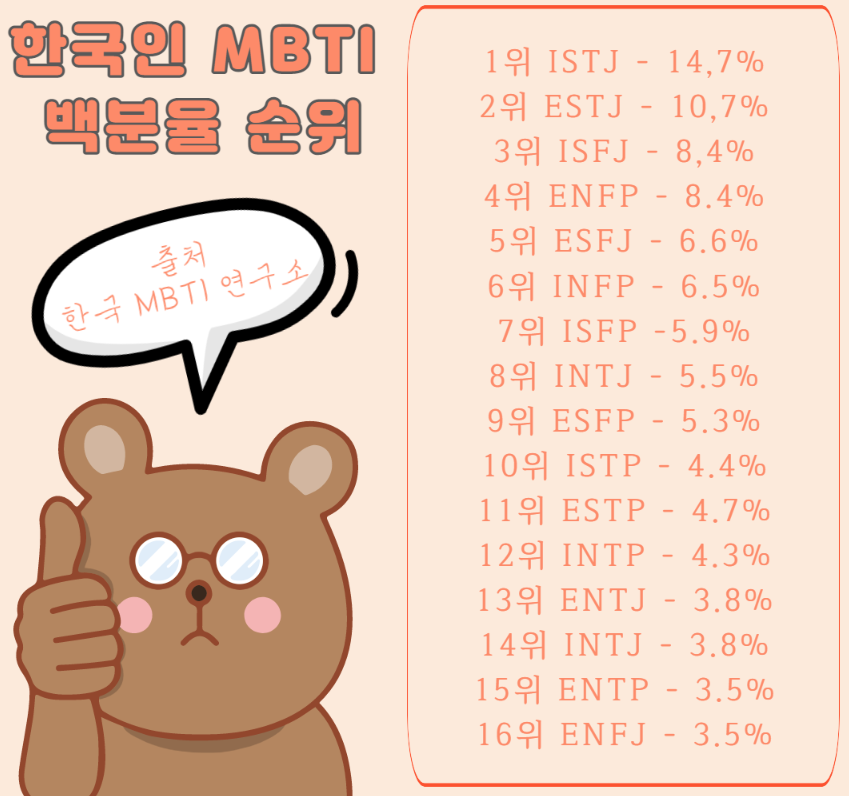 한국인들의 MBTI 1순위는 ISTJ, 즉 세상의 소금형 인간이 14.7%로 가장 많은 성격유형이며, 한번 시작한 일은 끝까지 해내는 성격을 가지고 있습니다. 두 번째로 높은 MBTI 순위는 ESTJ로, 사업가형이며, 사무적이고, 실용적이고, 현실적으로 일을 많이 하는 사람들로서, 10.7%가 이 성격을 가지고 있습니다.
