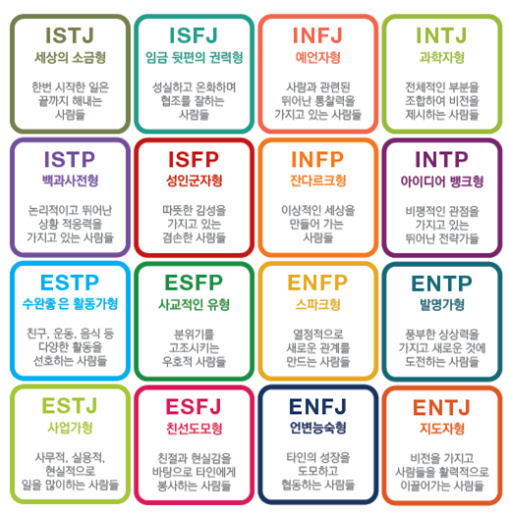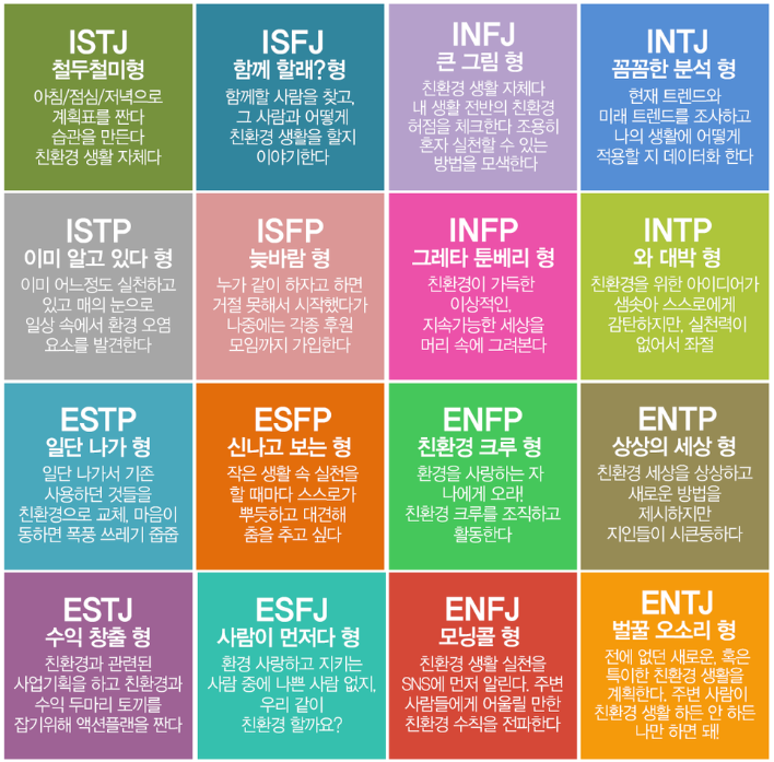 MBTI가 무슨 뜻이며, MBTI에는 각 성격에 따른 16가지 유형이 있다고 하는데 이번 시간에서는 MBTI 무료검사에 대해서도 알아보겠습니다. 각 성격 타입이 자신을 대변하게 되는 캐릭터인 만큼, 청소년에서부터 시작하여 성인들까지 그리고 연예인들에게까지도 주로 사용되고 있습니다.