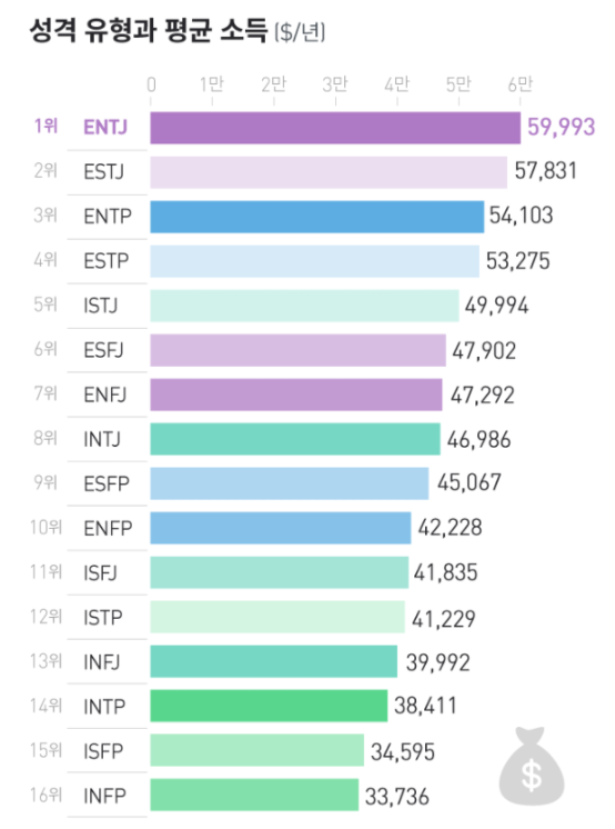 MBTI 유형별 연봉 순위를 보시고 계시며, 1위는 ENTJ형으로, 1년 평균 수입이 $60,000로 가장 높게 나타났으며, 지도자형이며, 비전을 가지고 사람들을 활력적으로 이끌어가는 리더형입니다. ISFP(성인군자형)과 INFP(잔다르크형)의 경우는 가장 낮은 연봉 순위를 기록하였습니다. 전체적으로 TJ성향이 연봉이 높으며, IP성향은 연봉이 낮은 경향을 보이는 것으로 알 수 있습니다.