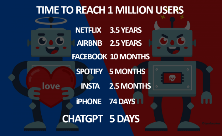 챗GPT는 단 5일만에 100만명의 유저를 만들어냈으며, 단 40일 만에 1000만 명의 유저를 만들어낸 괴물과도 같은 AI로봇 플랫폼입니다.