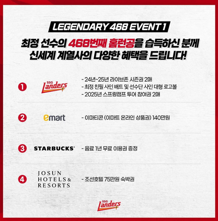 SSG 랜더스의 최정이 전날 467호 홈런을 기록하면서, KBO 통산 홈런 기록을 가지고 있는 이승엽 두산 감독과 어깨를 나란히 했습니다. 이에 신세계에서 SSG 랜더스의 최정의 468호 홈런에 대한 다양한 혜택을 제공하고 있어서 눈길이 가는데요. 어떤 혜택을 제공하는 지 확인해보겠습니다.