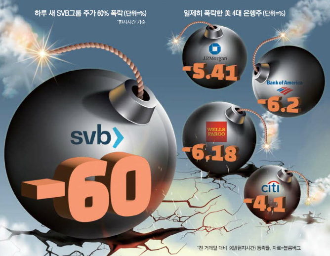 미 연방예금보험공사인 FDIC는 SVB의 모든 자산과 예금을 몰수하였으며, SVB 실리콘밸리 은행은 다른 은행과는 달리 하이리스크 앤 하이리턴 형식으로 실리콘밸리의 스타트업 기업에 돈을 빌려주고 받는 은행이며, 최근 인공지능 관련 회사가 모여있는 실리콘밸리에 위치한 회사들은 대부분 SVB 실리콘밸리 은행에 의지했던 것으로 조사되었습니다. 따라서, 미국의 스타트업을 주요 고객으로 하는 SVB가 파산을 하게 됨으로써, 200조 원에 달하는 예금이 보호받지 못하게 될 것이라는 분석이 나오고 있습니다. 이 때문에, SVB의 주가는 하루 만에 -60%의 하락을 맞이하게 되었으며, JP모건 -5.41%, 뱅크오브아메리카도 -6.2%나 하락하게 되었습니다.