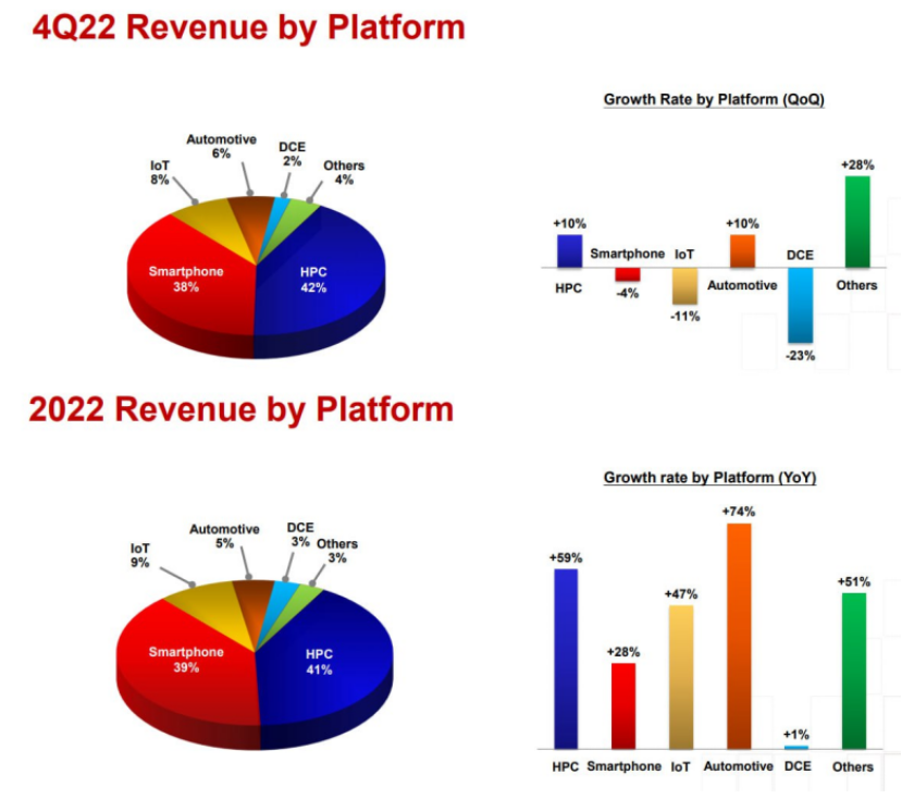 TSMC는 차량 반도체 부분에서 비약적으로 74%나 성장했으며, 이 비중은 향후 10년간 엄청나게 증가할 것으로 예상되며, 서버용 PC 수요는 감소할 것으로 예상했지만, 전분대 대비해서도 약 10% 상승했습니다. 의외로 작년 4분기에 아이폰 14 시리즈가 출시했는데도 불구하고, 팍스콘 등의 공급망 차질로 인해, 28% 밖에 증가하지 못한 면을 보여주었습니다. 하지만, TSMC 부회장의 말대로, 2023년도 1분기에는 전분기 대비 -14.2% 정도 하락할 것으로 보아, 반도체 하락 사이클이 가속화되고 있는 것으로 분석되었습니다.