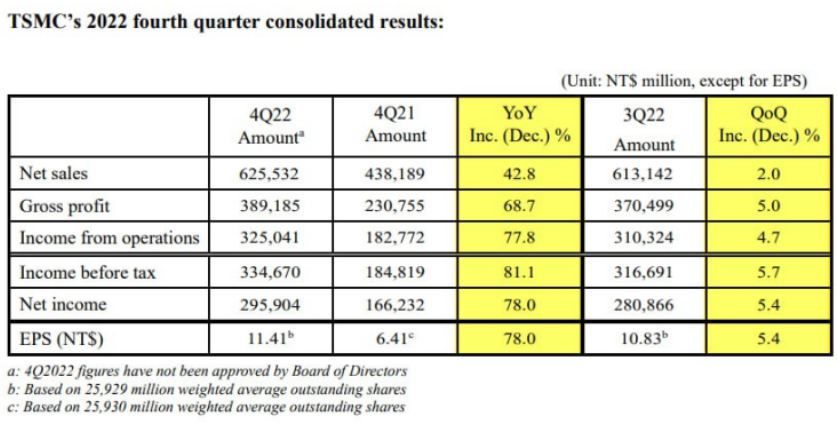 세계 최대 파운드리 반도체 위탁생산 업체인 대만의 TSMC가 2022년 4분기 신적을 발표했습니다. 당초 예상은 삼성전자와 SK하이닉스가 4분기 영업이익이 폭락하였기 때문에, TSMC 또한 어느 정도 타격을 받을 것이라 예상했지만, 놀라운 실적을 보여주었습니다.