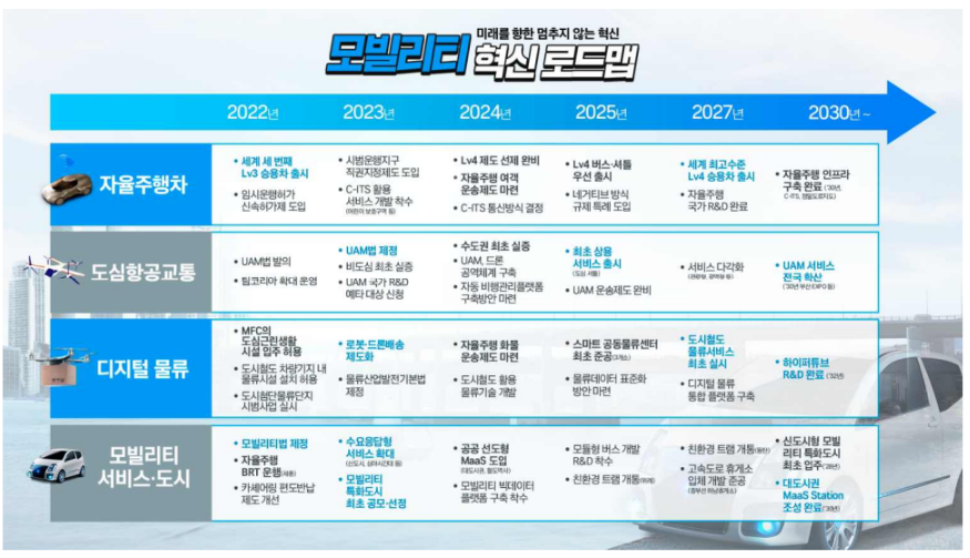 미국과 유럽을 필두로 하여, 각국에서 UAM사업의 상용화가 다가오고 있는 가운데, 한국도 현대차와 한화를 중심으로 미래 UAM 사업 전략을 발표하며 수직 이착륙 항공기 사업 투자와 개발 그리고 버티포트에도 투자 중에 있습니다. 한국은 UAM을 2025년에 실용화를 목표로 법제도 정비 및 시범사업을 추진할 예정이며, 이를 토대로 국내 UAM 서비스 도입과 세계시장 진출을 유도할 예정입니다.