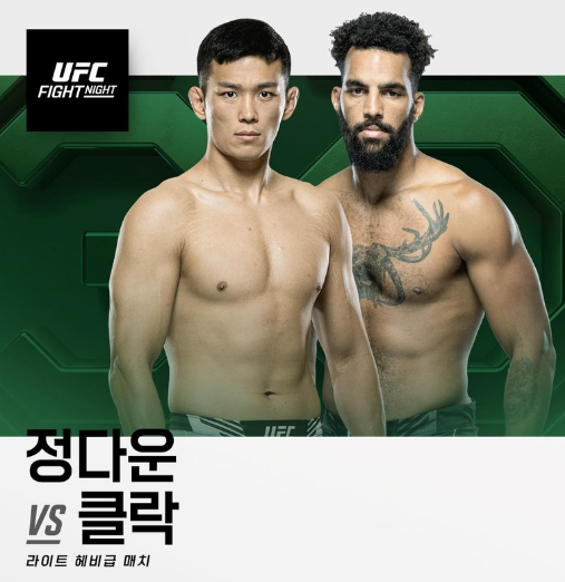 정다운은 UFC 파이트 나이트에서 클락과 라이트 헤비급 대결을 벌일 예정이며, 정다운은 프로에 데뷔한 이래 단 한 판도 지지 않고, 15경기 연속 무패(14승 1패) 행진을 벌였으나 지난해 7월 더스틴 자코비(35세, 미국)와 경기에서 1라운드 KO패를 당한 적이 있습니다. 데릭 루이스와 세르게이 스피박과의 메인이벤트 바로 전 경기로 배치가 되었으며, 정다운 선수가 이번에 승리를 거두게 되면, 다시 Top 10 안에 진입하게 되는 찬스를 받을 수 있을 것으로 예상됩니다.