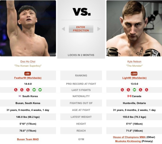 최두호의 복귀전 상대는 캐나다 출신의 동갑내기 파이터 카일넬슨이며, 통산 전적 13승 5패로, UFC에서는 1승 4패를 기록 중에 있습니다. 이번 경기를 앞두고 최두호는 UFC 페더급 랭킹 6위 '코리안 좀비' 정찬성의 지도를 받으며 훈련하고 있습니다. 특히 중점을 두고 있는 부분은 바로 체력이며, 고된 반복 훈련 끝에 과거보다 후반 라운드에 더 힘을 유지할 수 있게 되었다며 자신감을 가지고 있습니다.