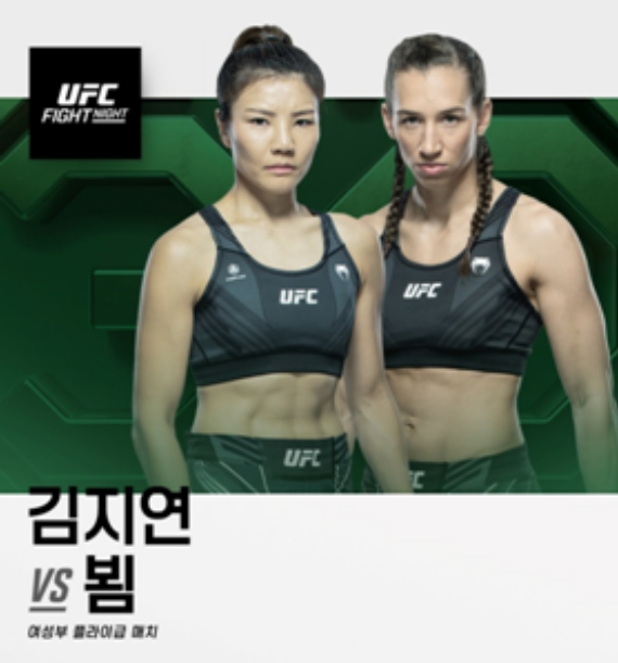 한국 UFC 유일한 여성 파이터 김지연은 동양 태평양여자복서협회 챔피언 출신으로 '불주먹'이란 별명답게 주먹이 매섭고, 17전의 종합격투기 커리어에서 단 한차례도 녹다운되지 않았을 정도로 맷집이 뛰어난 선수입니다. 현재는 아쉽게 4연패의 부진에 빠지게 되었으며, 이번 경기에서 만약 패배한다면 UFC에서 퇴출이 될지도 모르겠습니다.