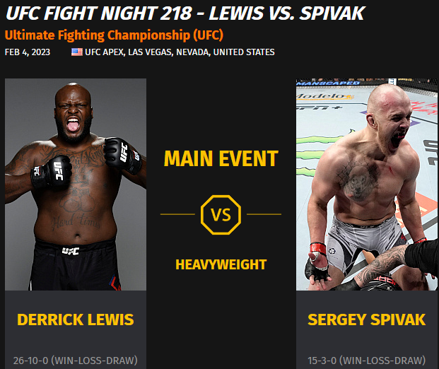이 경기의 메인 이벤트는 헤비급 매치인 데릭 루이스(랭킹 7위)와 세르게이 스피박(랭킹 12위)과의 대전으로, 데릭 루이스는 37세의 나이에 190cm의 키를 자랑하는 26승 10패의 전적을 자랑하며, 세르게이는 28세로 다소 젊은 나이에 15승 3패의 전적을 자랑하는 파이터입니다.