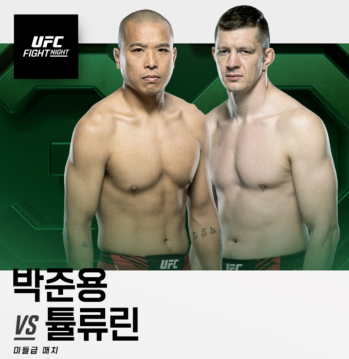 아이언 터틀이란 별명을 가지고 있는 박준용(31세)도 같은 대회에 출전하여 데니스 툴륜린(34세, 러시아)와 맞붙습니다. 김동현의 18전을 뛰어넘어 한국 UFC 최다 출전자가 되는 게 목표인 박준용은 3연승을 노리고 있습니다. 작년 2022년 10월 30일 조셉 홈스를 상대로 UFC 2연승을 신고한 적이 있습니다. 박준용은 프로 전적 15승 5패이며, UFC에서는 5승 2패를 기록 중입니다.