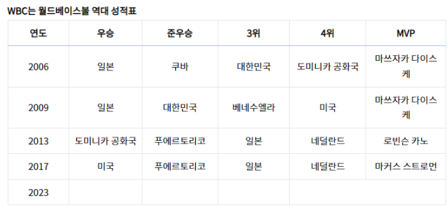 대한민국은 2006년부터 시작한 WBC에서 2009년, 2013년, 2017년 4번 모두 참가하였으며, 아래와 같은 성적을 거두었습니다.