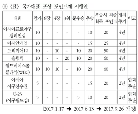 대신 대표팀 선수들에게 주어지는 것은 FA등록일수 보장입니다. WBC, 올림픽, 프리미어12, 아시안게임, APBC 등 대표팀에 참가해 1군 등록일수를 보상받는 것이며, 2017년 9월 KBO는 대표팀 참가일 수만큼 주던 FA 등록일수를 '포인트제'로 바꿨으며, 출장에 따른 기본 포인트에 대회 성적만큼 추가 포인트를 보상해 줍니다.