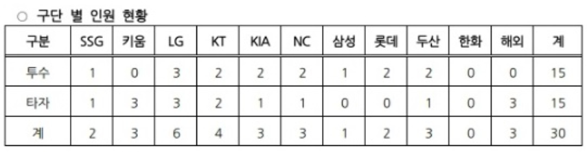이로서 LG는 최다 6명이 배출되었으며, 한화는 단 한명도 배출하지 못하는 상황이 생겼습니다. 한국은 현재 세계랭킹 4위로, 일본(1위), 호주(10위), 체코(15위), 중국(30위) 과 함께 B조에 속해 있습니다.