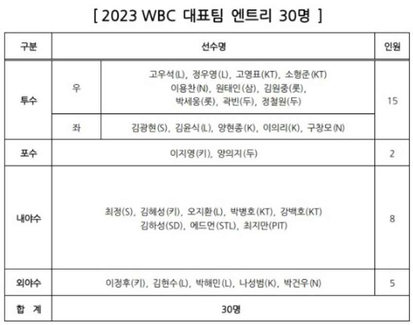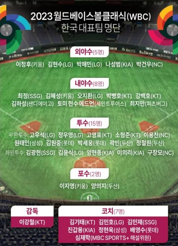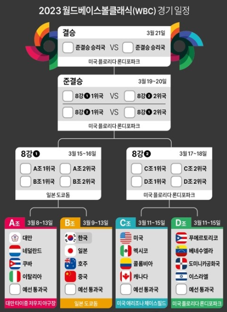 2023년 3월 WBC 대표팀 명단이 발표되었습니다. 한국은 2023년 WBC 조별리그 B조에 속해있으며, 일본, 호주, 중국, 체코와 한조를 이루며, 3월9일부터 12일까지 매일 한 경기씩 총 4경기를 갖게 되어 있습니다. B조에 두개의 팀이 8강에 진출하여 토너먼트 경기를 치루게 됩니다.